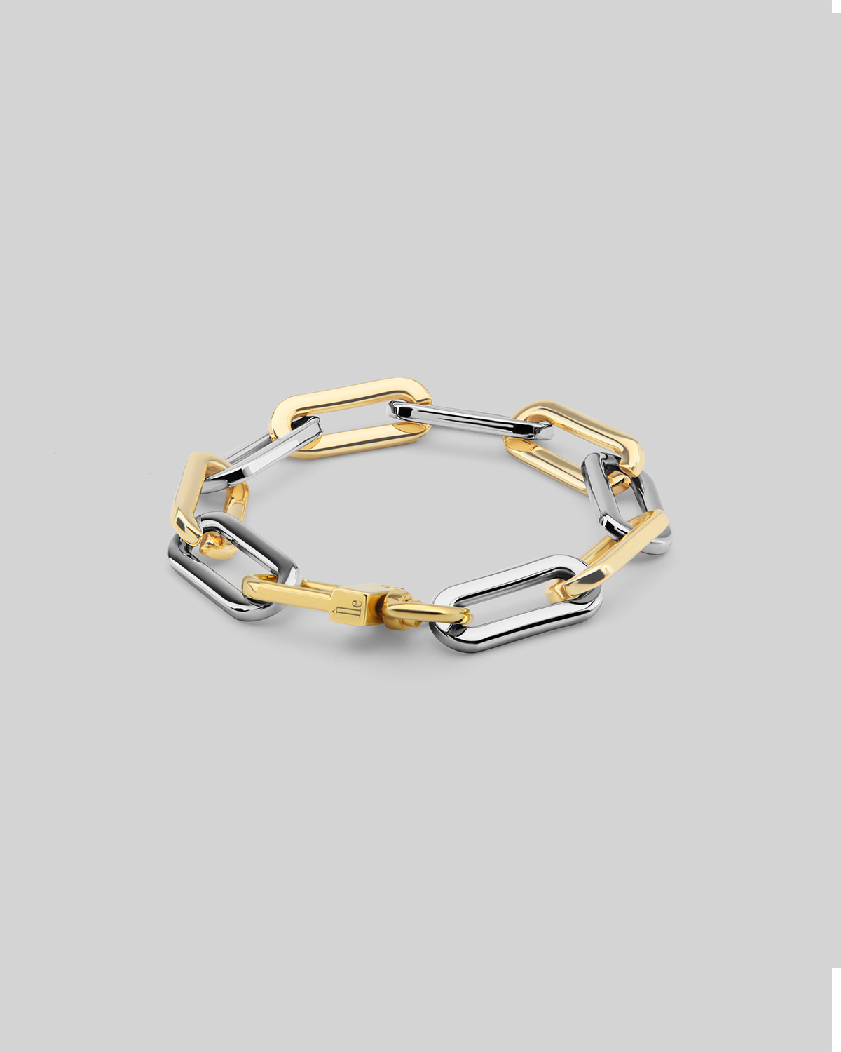 Браслет биколор в сочетании серебряного и золотого оттенков — графическое равновесие двух полюсов. Четкие звенья выдержанной формы чередуются в ритме, напоминающем конструктивизм современной архитектуры. Каждая деталь красноречива, без лишнего блеска — только форма, цвет и уверенная геометрия.