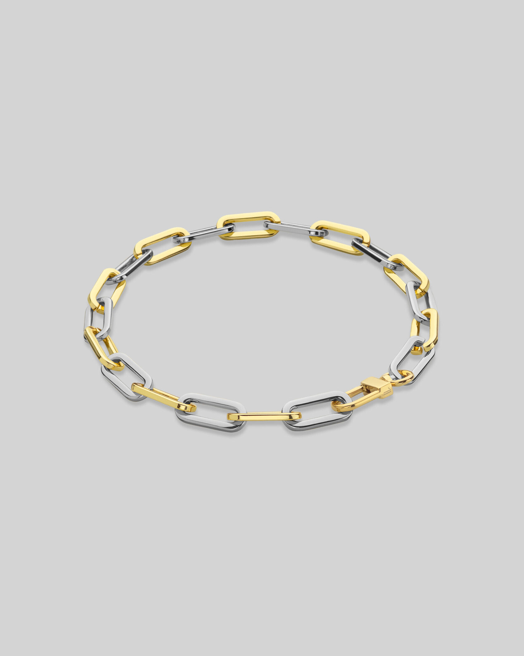 Чокер биколор в контрастном сочетании серебристого и золотистого цвета — о точности ритма и силе формы. Звенья чередуются в четкой последовательности, создавая динамичную композицию, которая легко читается в образе. Сочетание теплых и холодных оттенков работает на контрасте, но не конфликтует — наоборот, усиливает общее впечатление.