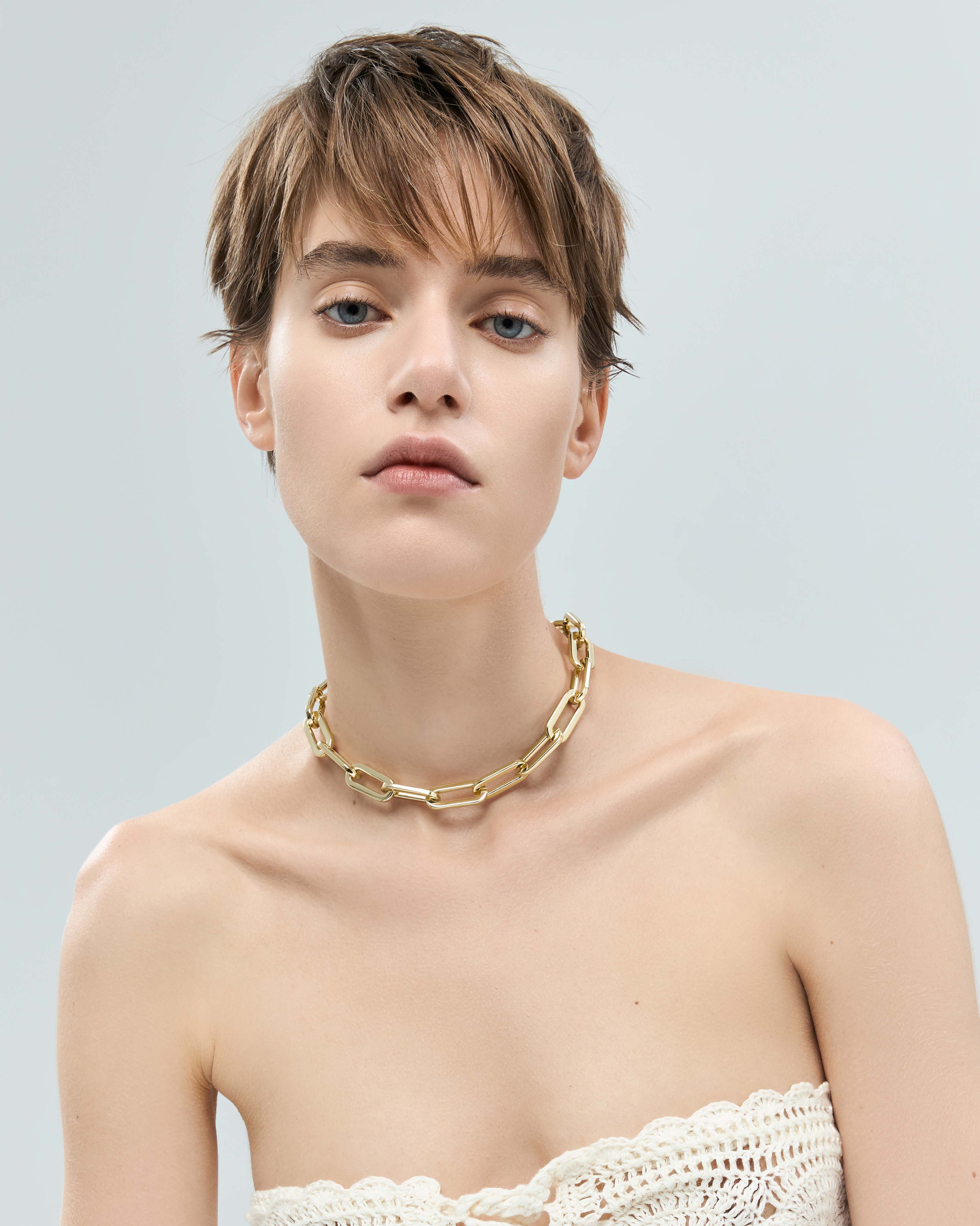 Чокер в золотом цвете – это о силе графики и чистоты линий. Звенья с мягкими углами образуют ритмичную последовательность, которая держит форму и создает визуальный акцент. Благодаря зеркальному блеску поверхности украшение умеет работать со светом – оно подчеркивает движение, а не затмевает его.