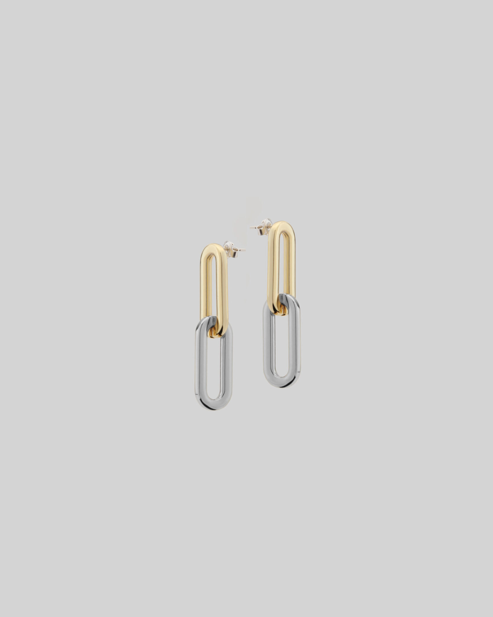 Серьги биколор — диалог двух цветов в четкой вертикали. Золотое верхнее звено и серебристое нижнее образуют простую, но точную композицию, которая легко интегрируется в разные образы. Вытянутые формы с мягкими закруглениями подчеркивают линию шеи, а благодаря зеркальной поверхности — взаимодействуют со светом в движении.
